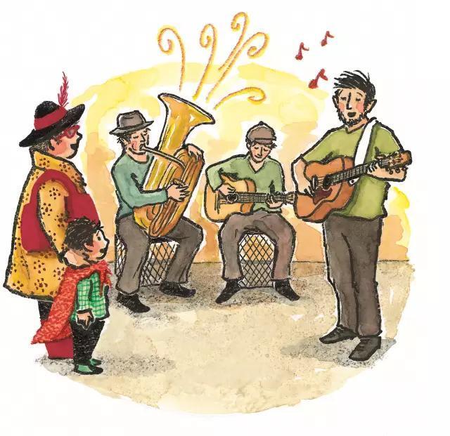 奶奶带着他去逛公园,同样也挤满了人,有的人忙着骑车,有的人忙着看书,有的人忙着游戏---却感受不到一丝慌张失措,反而满溢安宁与欢喜。接着奶奶带着小男孩去聆听街头艺人唱歌跳舞,音乐声一样震天价响,却给人带来喜悦。奶奶还领着小男孩一起关心动物,一起帮助乞讨者,学习怎样伸出援手,帮助有需求的人。透过奶奶的带领,小男孩终于体验到这个城市正如同奶奶说的,是那么热热闹闹、充满活力、处处有温情啊!