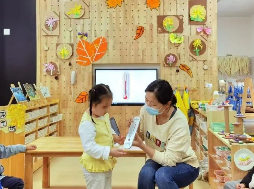 首先,老师们通过观察温度计、记录温差的形式向孩子们介绍了霜降节气的特点,了解节气的基本知识。