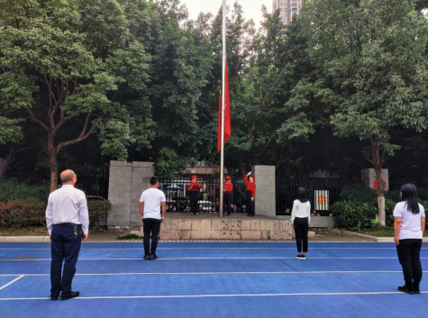 四名党员老师高举国旗,踏着《歌唱祖国》的铿锵曲调,昂首阔步,庄严出旗。五星红旗在阳光的照耀下更加鲜艳,老师们胸前的党徽在全校师生的注目中更加熠熠生辉。国旗冉冉升起,全体师生肃立敬礼,高唱国歌。深深凝望的目光,饱含了党员、团员、队员们对祖国的爱与祝福。