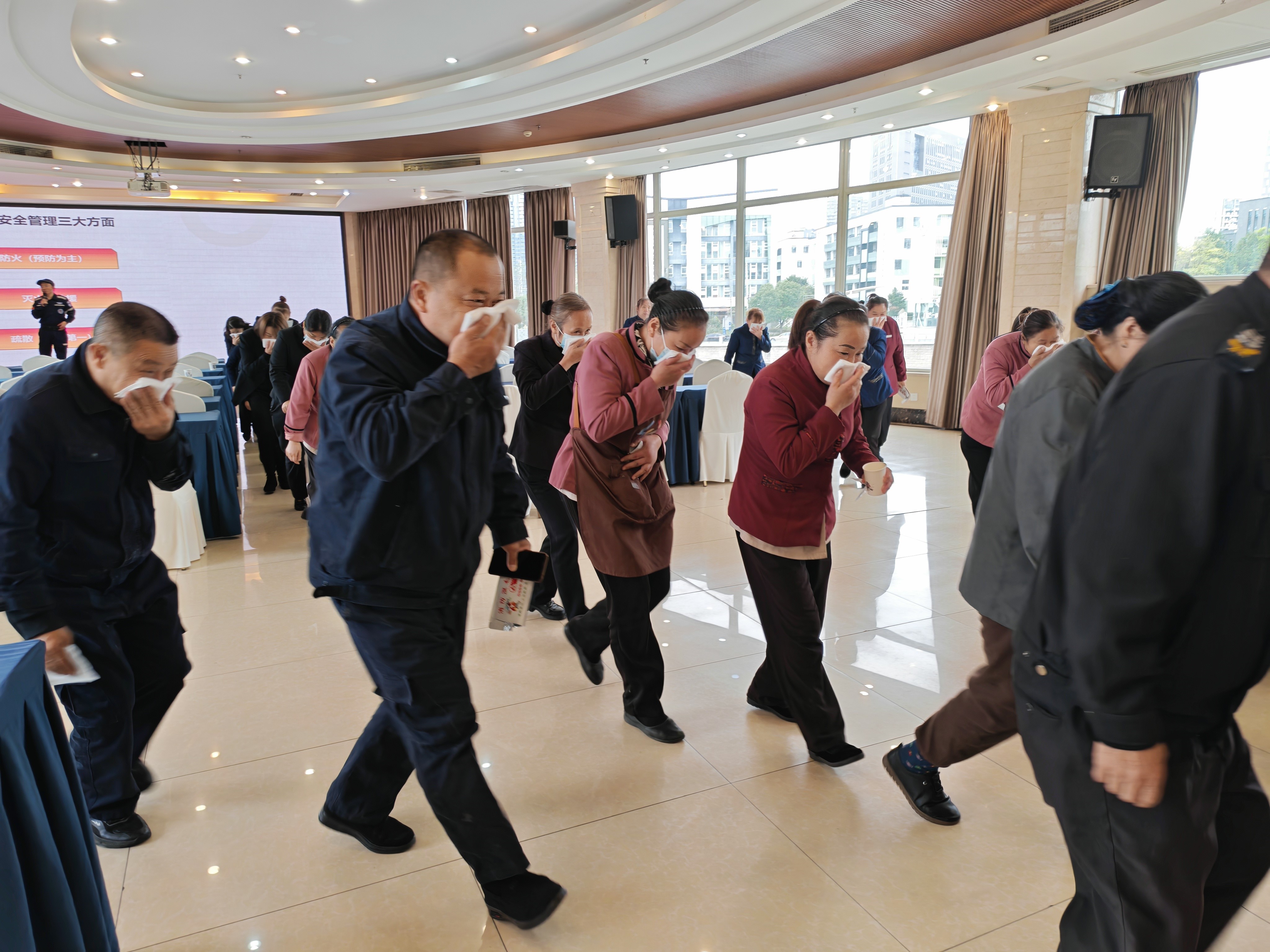 理论学习结束后,情景演练有序展开。随着老师说演练正式开始,现场点燃的烟饼迅速制造出逼真烟雾环境,疏散逃生演练正式启动。在老师和工作人员的引导下,参与者弯腰低姿、用湿毛巾捂住口鼻,沿着预定逃生通道快速有序撤离至酒店室外安全区域,整个过程紧张有序,充分检验了大家对逃生技巧的掌握程度。