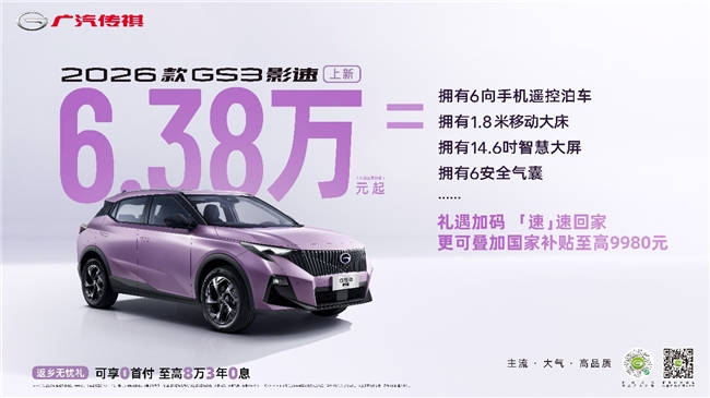 2025年燃油小型SUV销量榜正式公布,传祺GS3影速以全年65,474辆的国内销量稳居榜单前二,实现环比17.4%的增长,并保持连续近三年的销量攀升态势。在新能源车型不断普及、消费选择愈发理性的市场背景下,影速依托其“六边形战士”的产品优势与扎实的用户口碑,成功赢得市场认可。